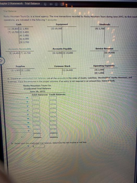 The nine transactions recorded by rocky mountain tours during june 20y2 its first month of operations are indicated in the following t accounts. Is a travel agency. Unadjusted trial balance june 30 20y2 debit balances credit balances cash 40000 common stock 40000 supplies b. The nine transactions recorded by rocky mountain tours during june 20y2 its first month of operations are indicated in the following t accounts trial balance rocky mountain tours co.